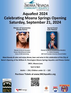 Aquafest Dinner - Join SNCA in celebrating the opening of the William N. Pennington Moana Springs Aquatics and Fitness Center. The evening will feature meeting and interacting with guest athletes Rowdy Gaines and Luke Hobson, an amazing BBQ Dinner by Men Wielding Fire, Hosted Beer & Wine, and a fun time celebrating the fabulous new pool.